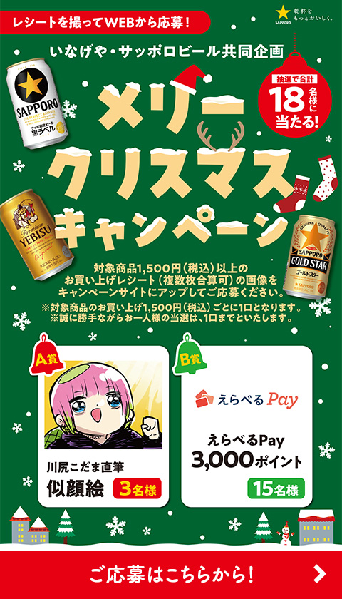 - ※賞品の当選数は、本フェア対象の全店舗合計の当選数となります。 ※C賞のWAON POINTのご応募には、対象カードなどの条件がございます。 ※C賞のWAON POINTにご当選の際、応募時にご入力いただいたWAON番号またはWAON POINT番号へポイント進呈いたします。 ※C賞はWAON POINT/いなげや商品券の他にフジ商品券、カスミ商品券、マルエツ商品券(いずれも5,000円分)もお選びいただけます。 ※C賞の当選数はWAON POINTと各種商品券の合計で500名さまとなります。