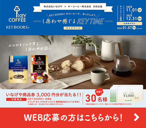 - ご応募にあたり、応募者の個人情報をお預かりする際には、キーコーヒー株式会社の個人情報保護方針に準拠して厳重に管理し、賞品の配送に伴う連絡及び賞品の配送に限り使用いたします。また、本キャンペーンのご当選者様の個人情報につきましては、景品表示法上、同時期に実施している同一製品を対象とした他のキャンペーンと重複当選を避けるために利用させていただく場合があります。なお、個人情報はご本人の同意なく、業務委託先以外の第三者に開示・提供することはございません(法令等により開示を求められた場合を除く)。その他個人情報の取り扱いにつきましては、キーコーヒー株式会社の個人情報保護方針をご確認ください。なお、本キャンペーンにご応募された方は、キーコーヒー株式会社の個人情報保護方針に同意したものとみなします。