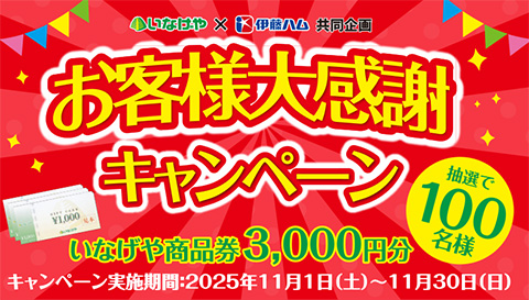 キャンペーン期間中に、いなげや各店でお買い上げの伊藤ハム取扱商品300円(税込・複数枚のレシート合算可)以上のお買い上げレシートとバーコードを1口として専用応募ハガキまたは郵便ハガキに貼り、郵便番号・住所・氏名・電話番号・ご利用店名を明記の上、ご応募ください。