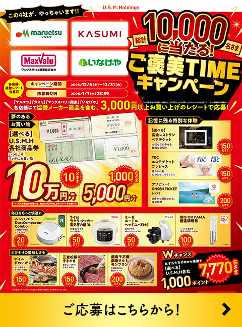USMH各社で使える選べるポイント1,000ポイント※Wチャンスは、①~⑫にはずれた方の中から抽選となります。
