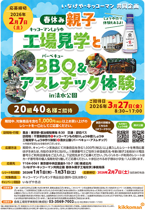 キッコーマンしょうゆ工場見学とBBQ&アスレチック体験ご招待 【20組40名様】